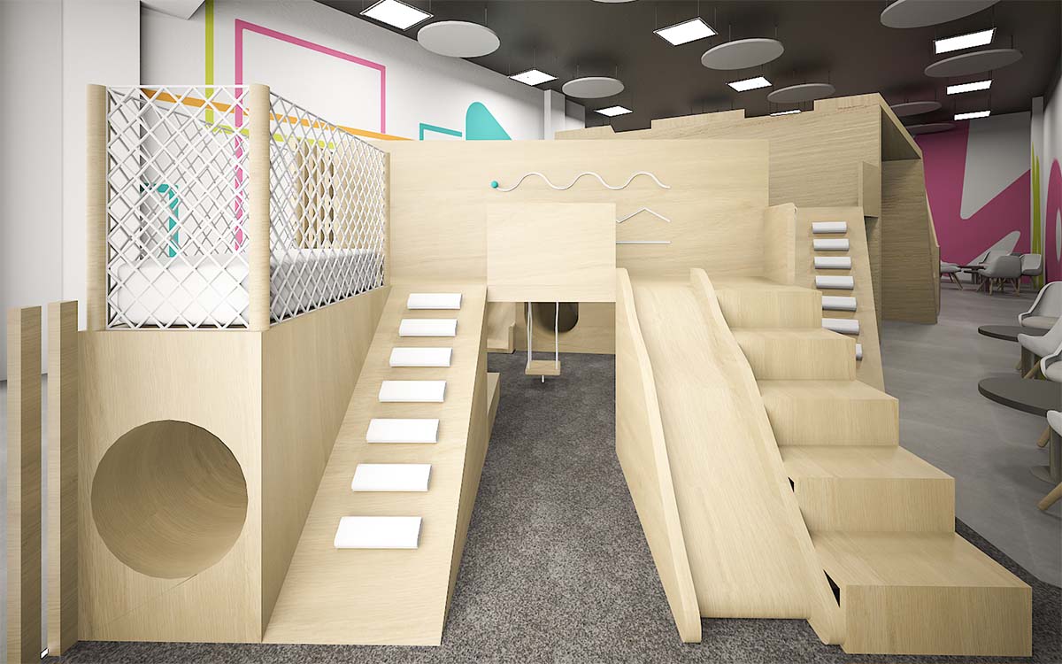 The main element of which are the games, which are divided into zones defined by age, there are also areas for parents to watch play to their children.