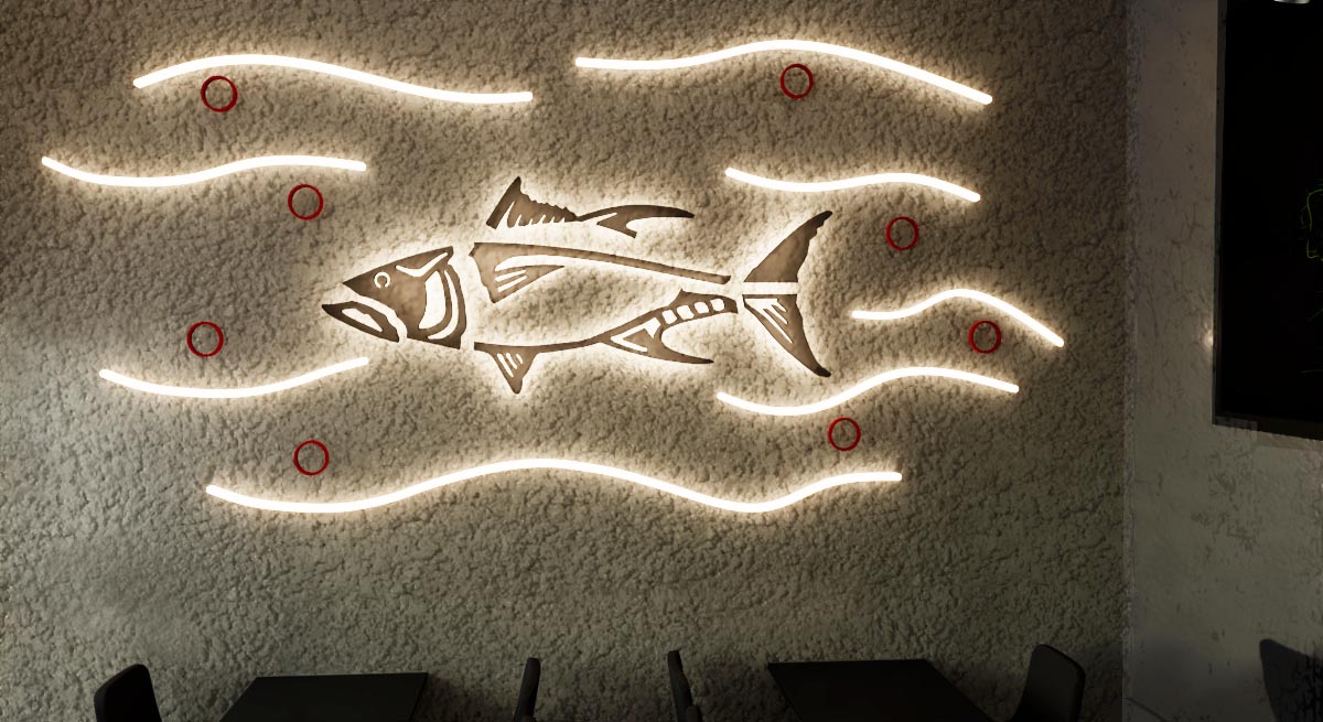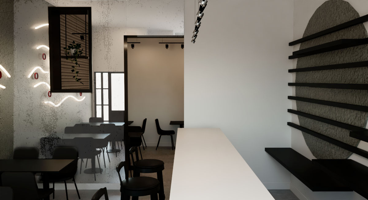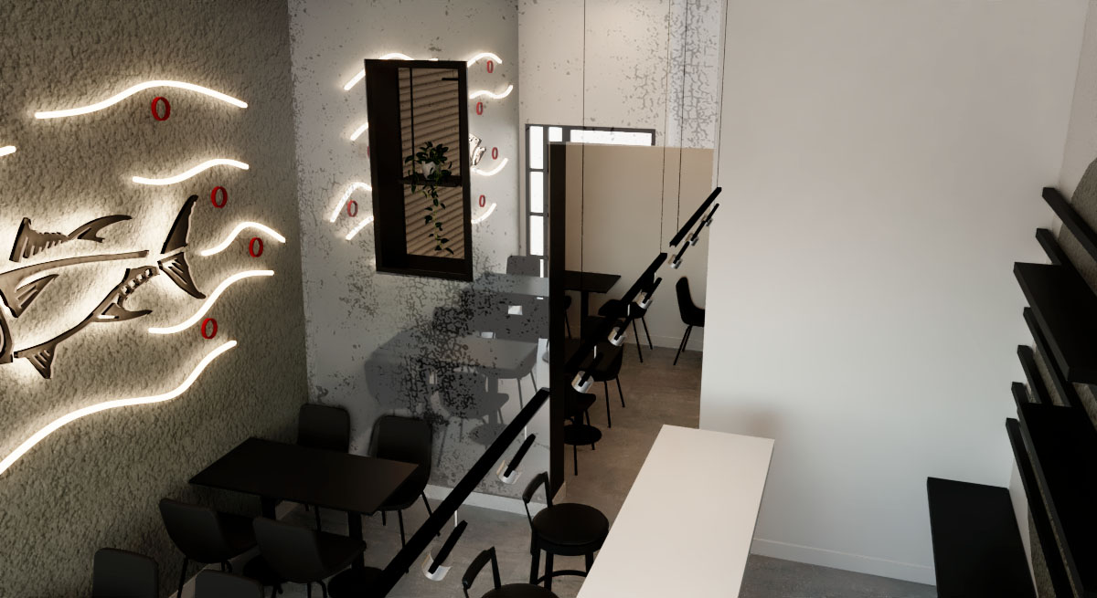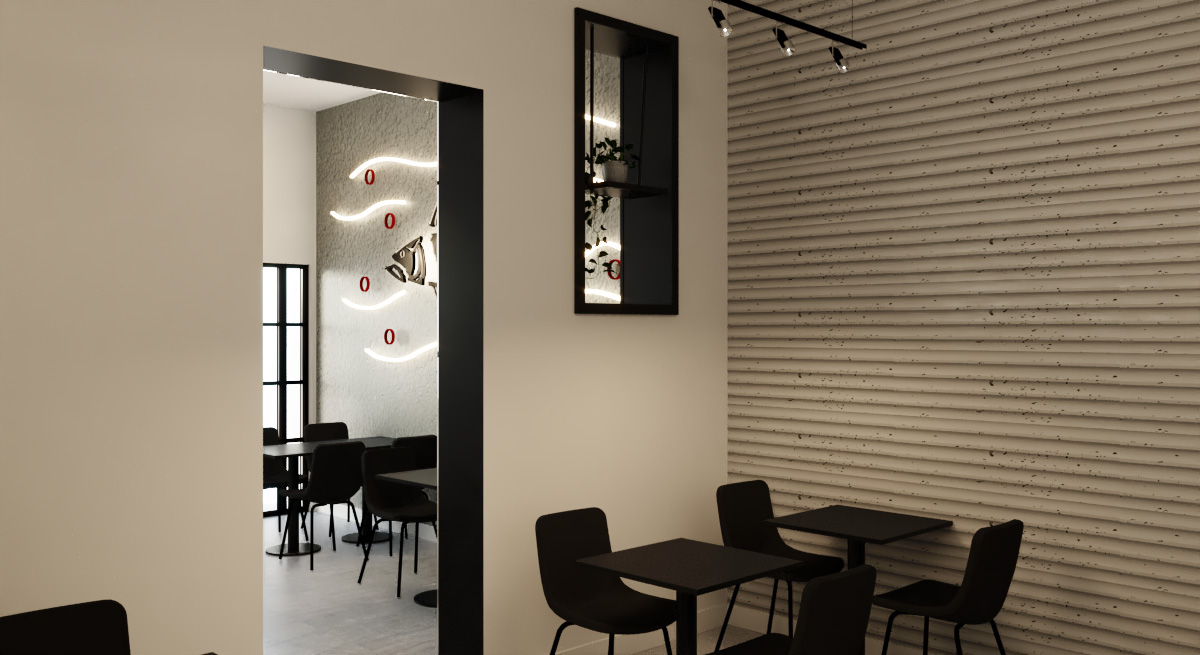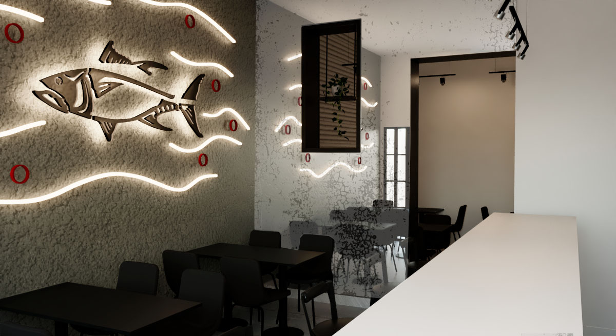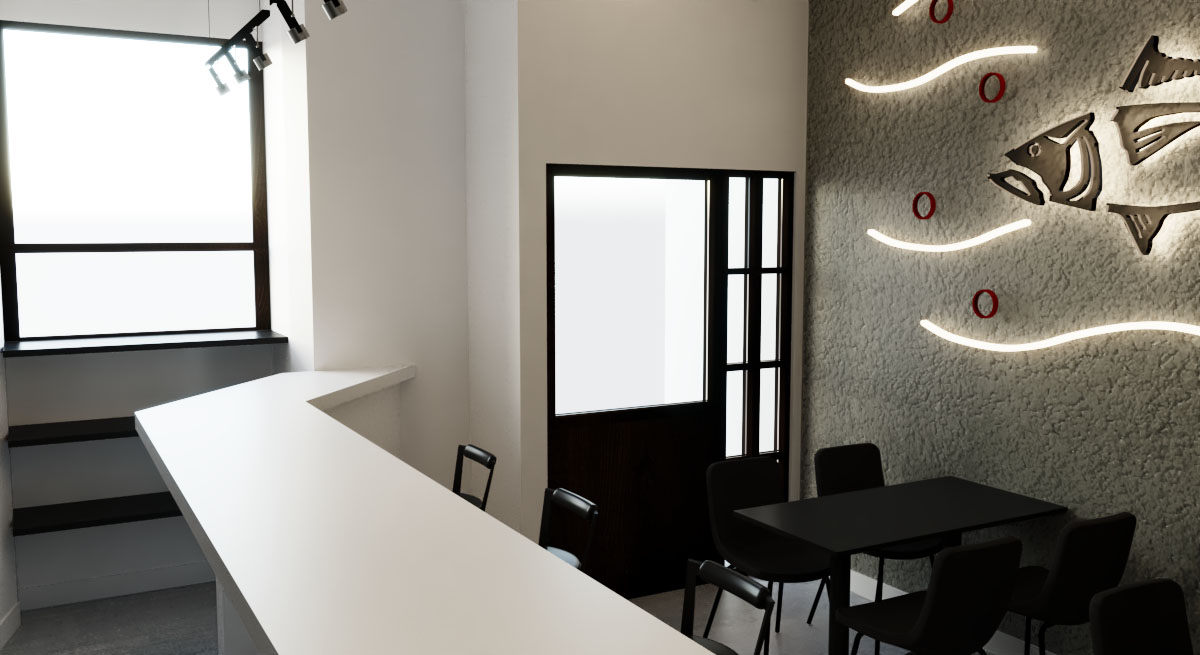The black color is the one who marks all of the design, and the combination of the neon lights, and white, taking centre stage a design wall with neon refers to the primary product of sushi (tuna) in contrast to the bar where they make the sushi inviting the customer to observe all the process of elaboration.