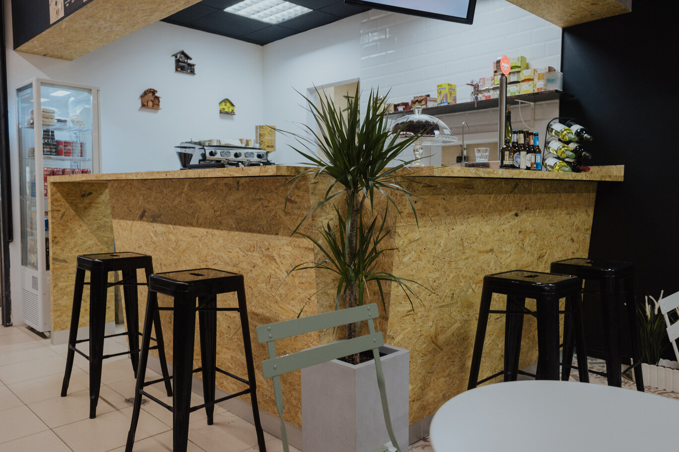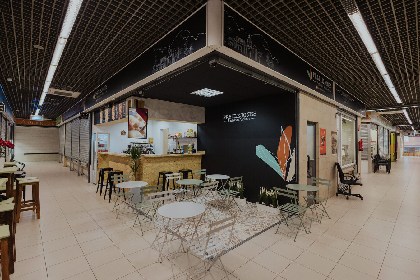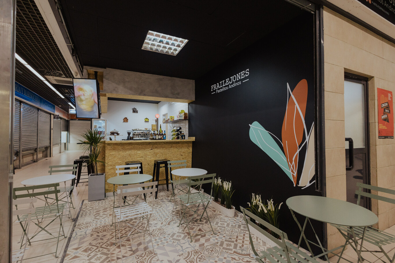 The local is distributed in two area of 55m2, the area of the workshop is completely visible to the outside so that the layout of the machinery, it has been done carefully, the second area (customer service, and consumption) is distributed in a bar of attention and an area of tables built-in the aisles of the market, in this way to invite visitors to the market to enter the local easy way, giving relevance to the corner in which it is located.