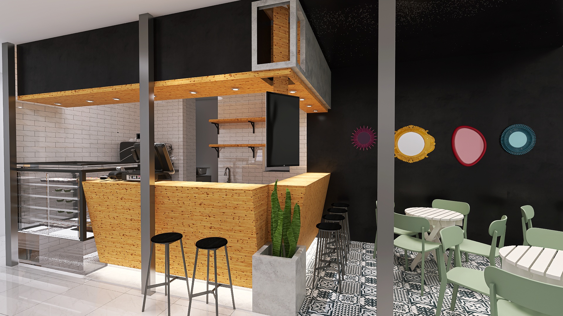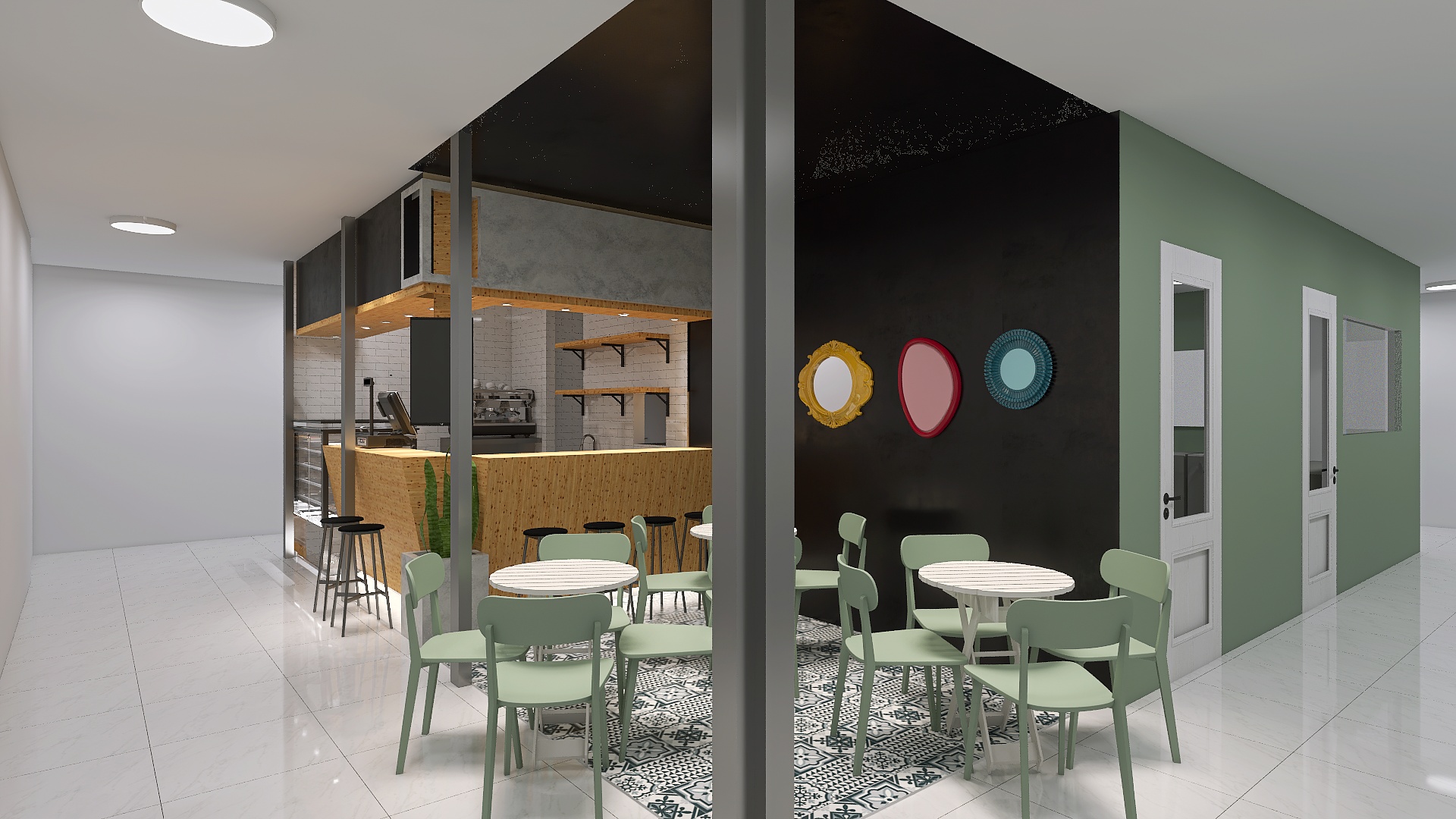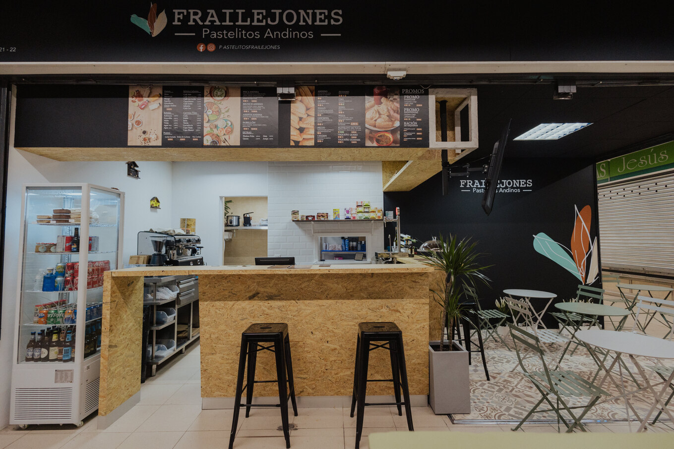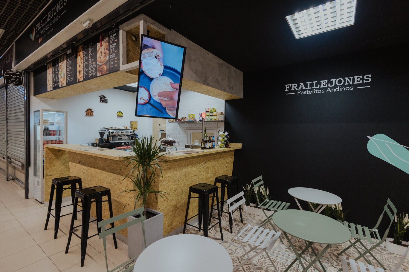 The local is distributed in two area of 55m2, the area of the workshop is completely visible to the outside so that the layout of the machinery, it has been done carefully, the second area (customer service, and consumption) is distributed in a bar of attention and an area of tables built-in the aisles of the market, in this way to invite visitors to the market to enter the local easy way, giving relevance to the corner in which it is located.