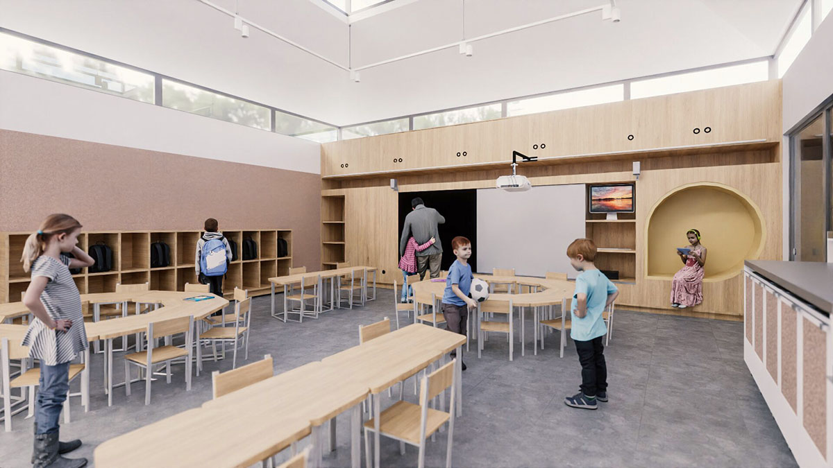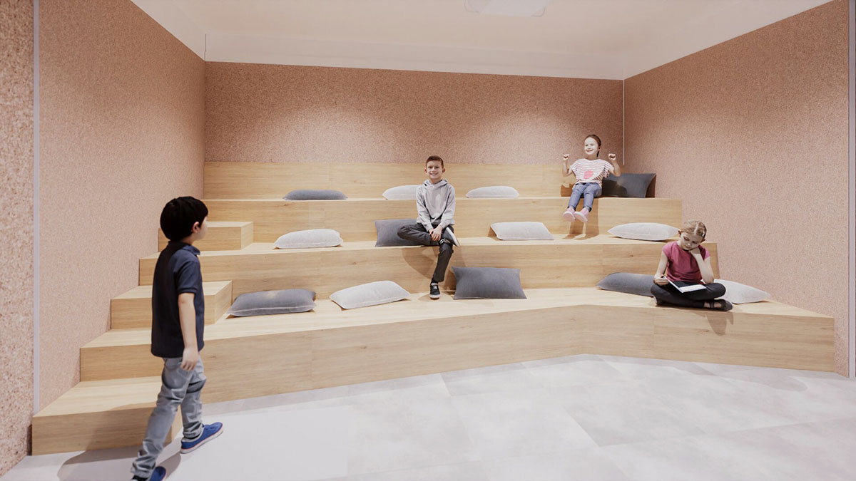 Reimaginamos cada rincón: rediseñamos la distribución de los baños, aportamos mayor luminosidad y creamos un área de gradas que hoy funciona como un pequeño teatro, ideal para actividades dinámicas y momentos mágicos para los niños.