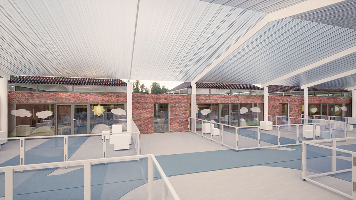 El patio también fue completamente renovado. Incorporamos un pavimento continuo de caucho para mayor seguridad y comodidad, y diseñamos estructuras metálicas móviles que permiten delimitar zonas por clases o unificarlas en un gran espacio abierto, listo para ser compartido por todos.