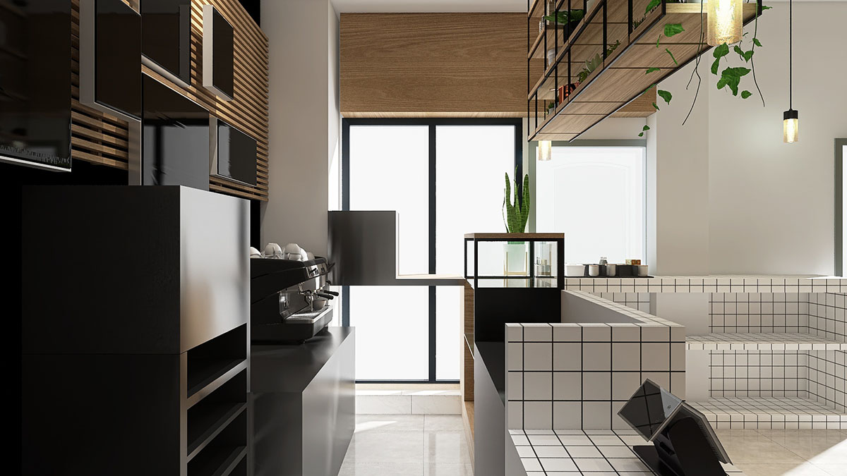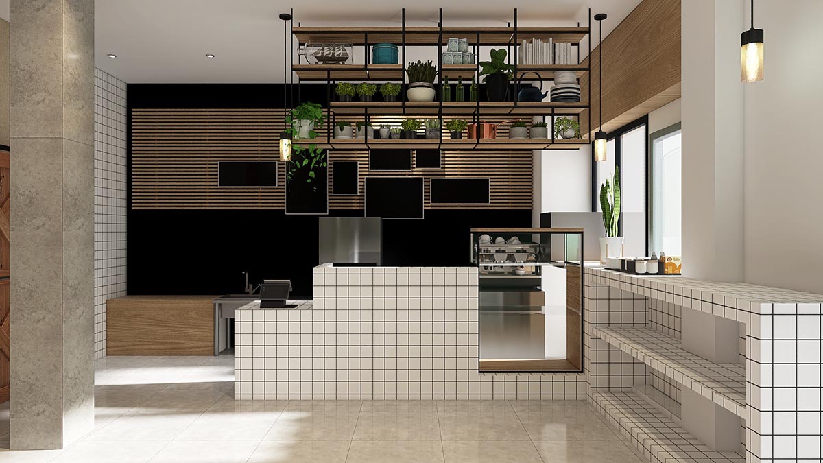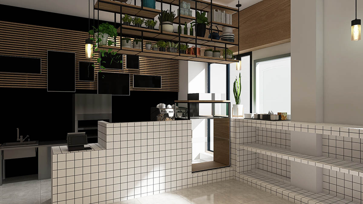 Desde el ámbito estético nuestra propuesta esta relacionada a un aspecto de lineas muy limpias con mucho juego geométrico, destacando así la linea negra sobre todo el conjunto, que se observa en todo el mostrador desde el alicatado hasta las lineas de que componen la estantería aérea, por otro lado las lineas en las texturas de las paredes y en la estructura colgante del techo.