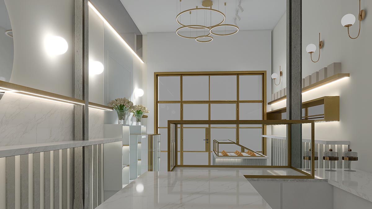 Esta compuesto por dos espacios, ambos tratados con un concepto minimalista y lujoso, escogiendo paletas de colores que nacieran de un solo tono y este se fuese degradando. En la planta alta se trabajo con el color blanco mezclado con sombras para generar diversos grises y fuese un espacio de mucha luz y en la planta sótano con el mismo blanco mezclado con marrones para crear un ambiente más cálido, todo hilado por el dorado en diversos detalles que van desde lineas del mobiliario hasta la selección de la iluminación.